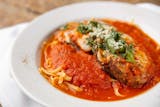 With fettuccine, roasted peppers, onions, zucchini with marinara sauce.